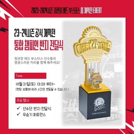 정관장 레드부스터스가 오는 21일 오후 2시 2023~2024 정관장 프로농구 공식 개막전 행사를 진행한다고 13일 밝혔다.
