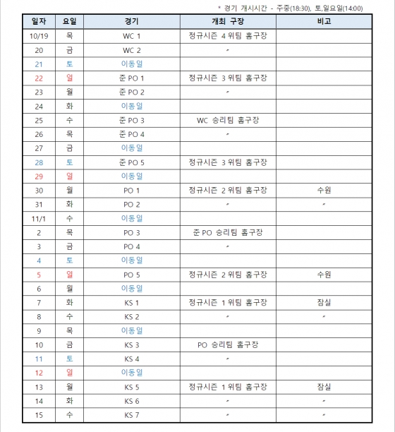 준플레이오프와 플레이오프는 각각 5전 3선승제로 펼쳐진다. 준플레이오프 1차전은 10월 22일 정규시즌 3위 팀 홈구장에서 열린다. 준플레이오프 1, 2, 5차전은 3위 팀의 홈구장, 준플레이오프 3, 4차전은 와일드카드 승리 팀의 홈구장에서 각각 거행된다. 이어 플레이오프 1차전은 오는 30일 수원 KT 위즈파크에서 시작을 알린다. 플레이오프도 준플레이오프와 마찬가지로 1, 2, 5차전은 2위 팀의 홈구장, 3, 4차전은 준플레이오프 승리 팀의 홈구장에서 한다.