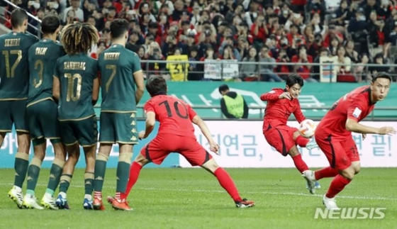 기다리던 한국의 첫 골이 터졌다. 주인공은 이강인인이었다. '판타스틱' 왼발 프리킥을 날렸다. 후반 10분 이강인은 센스 넘치는 움직임을 통해 좋은 위치에서 프리킥을 얻어냈다. 이어 자신이 직접 키커로 나섰다. 이강인의 왼발을 떠난 공을 그대로 골문을 흔들었다.
