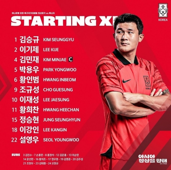 예상치 못한 변수는 있었다. 이날 황인범(즈베즈다), 박용우(알아인)가 중원을 조율할 예정이었지만, 경기 직전 선발 명단이 바뀌었다. 황인범 대신 홍현석(KAA헨트)이 선발 출전했다. 대한축구협회는 "황인범이 워밍업 도중 본인이 왼쪽 내전근(허벅지 안쪽) 불편함을 느껴 풀타임 경기가 힘들 것으로 예상, 코칭스태프 협의 후 홍현석 선수로 교체됐다"고 설명했다.