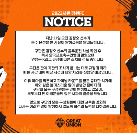 강원FC는 13일 구단 공식 채널을 통해 "지난 11일 오전 김정호가 음주운전을 한 사실이 밝혀졌음을 알려드린다. 구단은 김정호의 음주운전 사실 확인 후 즉시 한국프로축구연맹에 알렸으며, 연맹은 K리그 규정에 따른 조치를 검토 중"이라고 밝혔다.