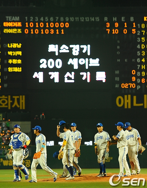 세이브가 완성되자 포수 강민호가 먼저 마운드에 올라가 오승환을 안아줬다. 이어 선수들도 모두 내야로 달려와 기록 달성을 축하하는 모습을 보였다. 이 세이브 하나가 단순한 기록이 아니었기 때문이다.