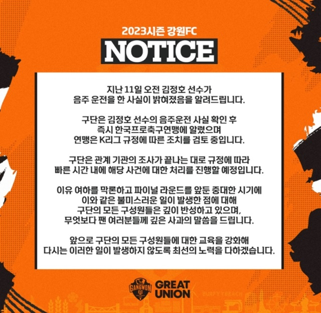 직업을 막론하고, 그 누가됐든 음주운전을 하지 않는 게 기본 상식이다. 그런데 축구계에선 또 음주운전 적발 사건이 발생했다. 올해만 벌써 3번째다. 이번에는 강원FC의 골키퍼 김정호(25)가 음주운전을 한 사실이 밝혀져 팬들에게 충격을 안겼다. 강원 구단은 지난 13일 구단 SNS를 통해 김정호의 음주운전 사실을 전하며 "구단은 관계 기관의 조사가 끝나는 대로 규정에 따라 빠른 시간 내에 해당 사건에 대한 처리를 진행할 예정"이라고 밝혔다. 한국프로축구연맹 역시 김정호에게 K리그 공식 경기 출장을 60일 동안 금지하는 활동 정지 조치를 취했다.