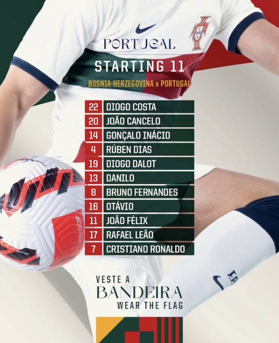 원정팀 포르투갈은 4-3-3 포메이션으로 라인업을 꾸렸다. 공격에 하파엘 레앙-주앙 펠릭스-크리스티아누 호날두(C)가 출격했다. 미드필드에는 오타비우-다닐루-브루노 페르난데스가 이름을 올렸다. 수비에는 주앙 칸셀루-곤살루 이나시우-후벵 디아스-지오구 달로가 호흡을 맞췄다. 골키퍼 장갑은 지오구 코스타가 꼈다.