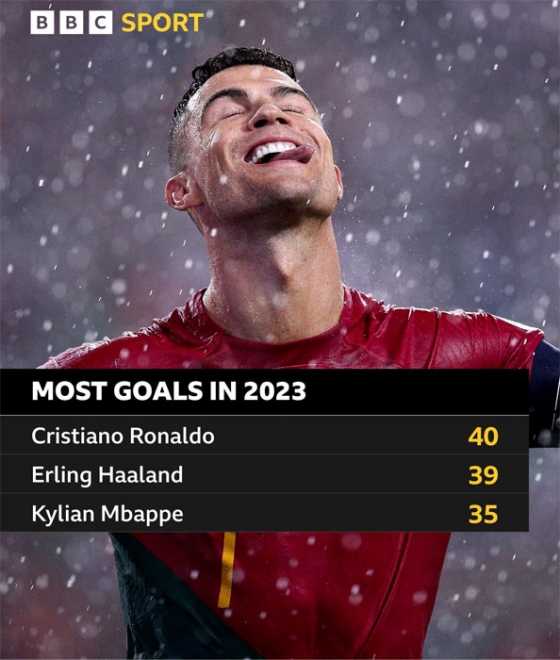 호날두는 엘링 홀란, 킬리안 음바페 등 한창 폼이 좋은 공격수들보다 많은 골을 넣었다. 호날두는 지난 시즌 사우디아라비아 알 나스르에서 14골을 넣었고, 지난 8월 2023 아랍클럽챔피언스컵에서 6골을 넣으며 득점왕이 되는 동시에 팀을 우승으로 이끌었다.