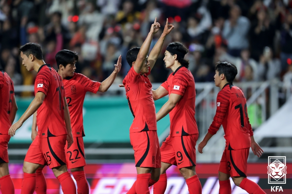 한국은 4-1-3-2 포메이션을 가동했다. 사타구니 부상에서 회복 중인 손흥민이 선발로 전격 복귀했다. 최전방 투톱에 손흥민과 조규성이 나서고 2선에 황희찬, 이재성, 이강인이 섰다. 박용우가 수비형 미드필더로 중원을 지켰다. 포백에는 이기제, 김민재, 정승현, 설영우가 포진했다. 골키퍼 장갑은 조현우가 꼈다.
