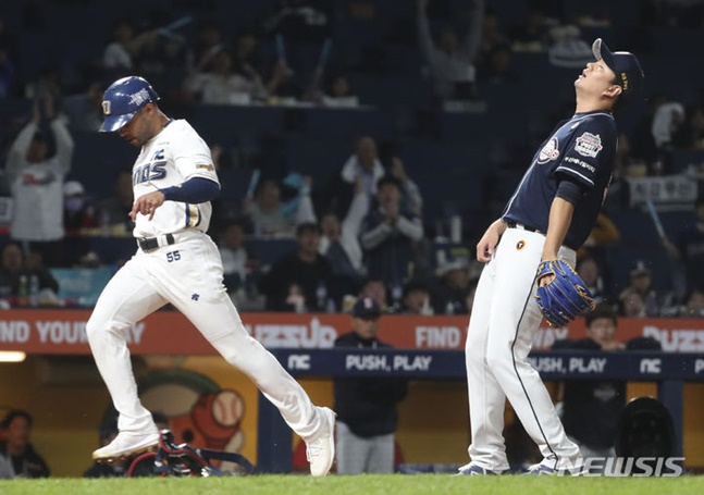 김주원의 우익수 뜬공 때 마틴이 3루로 향했다. 2사 3루. 서호철 타석에서 볼 카운트 1-3으로 몰린 이영하의 포크볼이 바운드되며 크게 빠졌다. 그 사이 마틴이 손쉽게 득점에 성공했다. 다시 1점 차 리드를 잡았다.