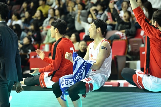 이날 경기 전 정관장의 우승반지 전달식이 진행됐다. SK로 떠났지만, 오세근도 함께 했다. 홀로 다른 유니폼을 입은 오세근은 이전 동료들과 포옹을 나눴다. 정관장 팬들도 뜨거운 환호를 보냈다.
