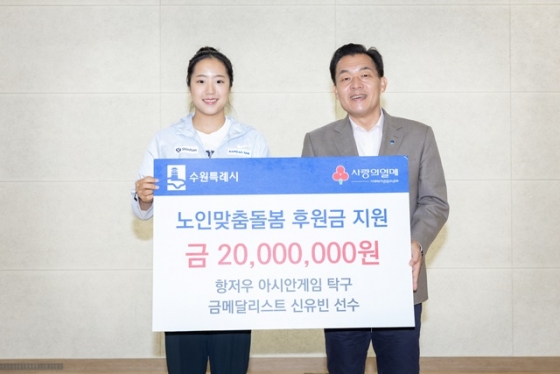 신유빈의 소속사 매니지먼트GNS는 "신유빈이 수원시에 '노인맞춤돌봄 후원금' 2000만 원을 기탁했다"고 22일 밝혔다. 이와 함께 신유빈은 "홀로 사는 저소득층 어르신에게 전달해 달라"고 부탁했다.