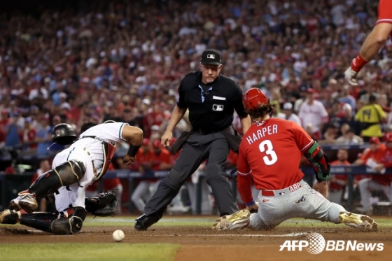 1루 주자 스탓은 곧장 2루를 훔쳤는데 이때 하퍼의 기민함이 빛났다. 모레노가 2루로 송구한 틈을 타 하퍼는 홈 스틸을 시도했다. 애리조나 2루수 마르테가 저지하려 했으나, 송구가 홈에서 벗어났고 모레노가 받는 과정에서 쇄도하던 하퍼와 충돌해 쓰러졌다. 하퍼는 모레노를 살피면서도 재차 홈플레이트에 다시 터치해 득점을 확인했다. 필라델피아의 2-0 리드.