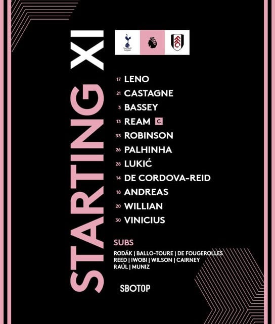 풀럼도 4-2-3-1 포메이션을 택했다. 비니시우스가 최전방 공격수로 출전했고, 그 밑을 윌리안-안드레아스 페레이라-바비 리드가 지원했다. 미드필드엔 주앙 팔리냐-사사 루카치가 위치했다. 수비는 안토니 로빈슨-팀 림-칼빈 베시-티모시 카스타뉴로 구성됐다. 골키퍼 장갑은 브렌든 레노가 꼈다.