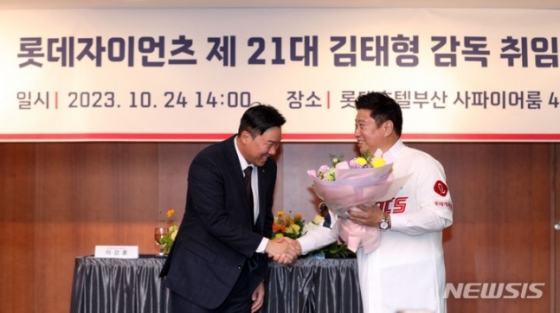 김태형 감독은 24일 오후 2시 부산광역시 부산진구 롯데호텔부산 사파이어룸에서 열린 롯데 제21대 감독 취임식에서 "야구도시 부산에 롯데 감독으로 부임해서 설레고 기대된다"고 말했다.