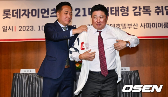 김태형 감독은 24일 24일 오후 2시 부산광역시 부산진구 롯데호텔부산 사파이어룸에서 롯데 제21대 감독 취임식을 가졌다. 이날 행사에는 이강훈 롯데 대표이사와 주장 안치홍을 비롯해 전준우, 구승민, 김원중 등이 참석했다.