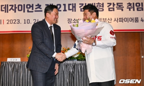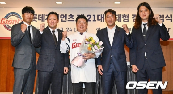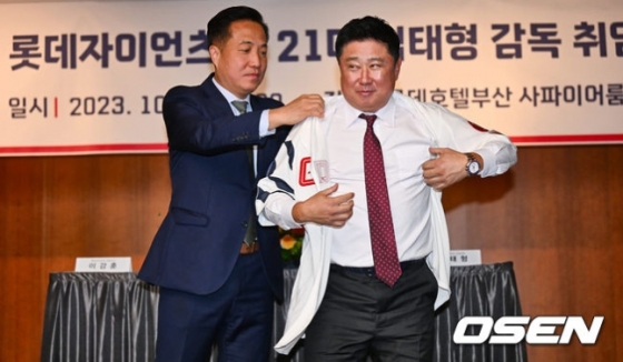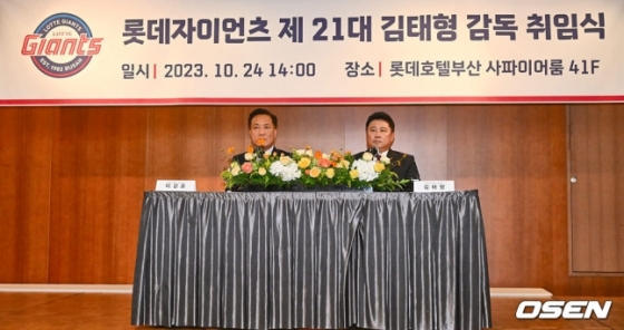 김태형 감독은 24일 24일 오후 2시 부산광역시 부산진구 롯데호텔부산 사파이어룸에서 롯데 제21대 감독 취임식을 가졌다. 이날 행사에는 이강훈 롯데 대표이사와 주장 안치홍을 비롯해 전준우, 구승민, 김원중 등이 참석했다.