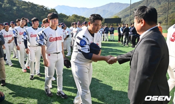 이어 김 감독은 코칭스태프와 선수단, 프런트 직원들과 일일이 악수를 나누면서 첫 인사를 했다. 특히 '미래 거포' 한동희를 만나서는 볼을 만지며 특별히 인사를 전하는 모습이었다. 김 감독은 밝은 표정으로 구단 구성원들과 만남을 가졌다.