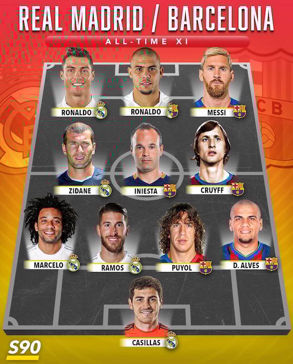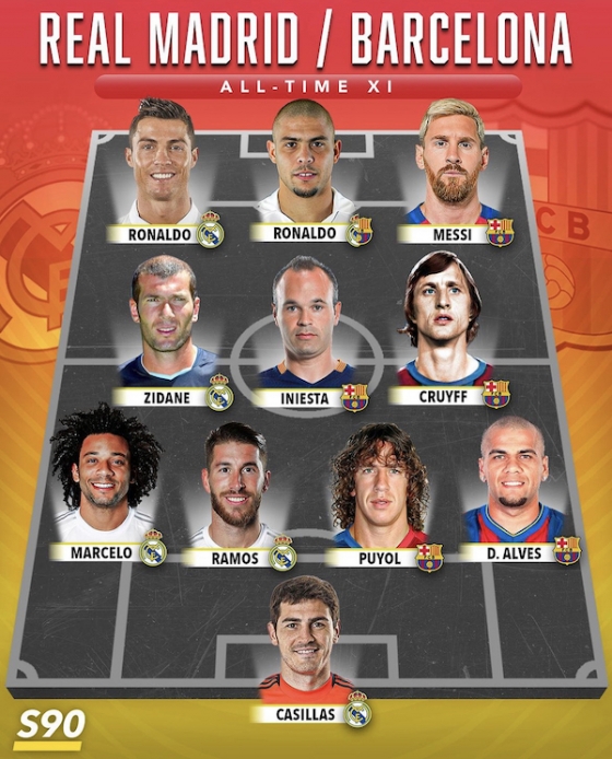 지난 27일(한국 시간) 축구 컨텐츠를 제작하는 ‘score90’은 레알 마드리드와 바르셀로나에서 뛰었던 선수들로 라인업을 구성했다.