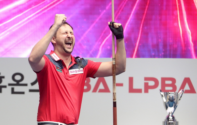 4회 우승자는 '스페인 대선배'를 향해 프로당구(PBA) 무대는 다르다는 걸 보여주는 듯 했다. '디펜딩 챔피언'이자 직전 대회 우승자 다비드 마르티네스(스페인·크라운해태)가 '3쿠션 4대천왕'으로 불린 다니엘 산체스(이상 스페인·에스와이)를 제압했다.
