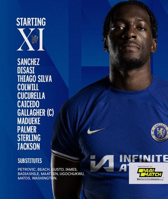 경기를 앞두고 첼시는 선발 라인업을 공개했다. 첼시는 4-2-3-1 포메이션으로 나왔다, 최전방 공격수로 잭슨이 출격한다. 2선에는 마두에케-파머-스털링이 뛴다. 3선 미드필더로는 카이세도-갤러거가 나서며 수비는 콜윌-디사시-실바-쿠쿠렐라, 골키퍼는 산체스가 출전했다.