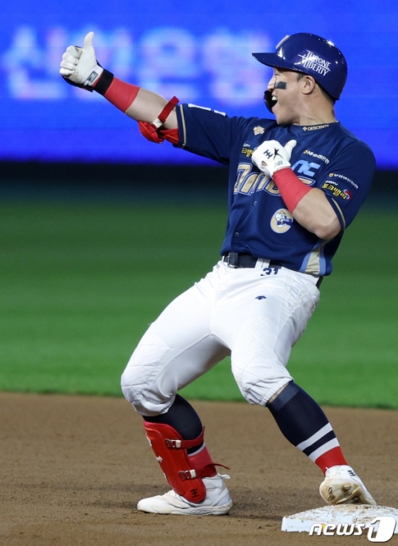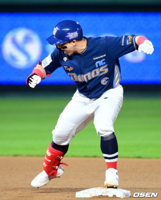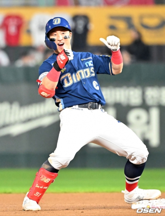 이번 가을야구에서 NC의 팀 분위기는 하늘을 찌를 듯하다. 선수들은 득점이 올라가면 더그아웃에서 엄청난 환호를 보내고, 안타를 친 선수들도 적극적으로 세리머니를 하고 있다. 손아섭도 마찬가지였다. 그는 지난 준플레이오프 2차전에서 팀이 5-3으로 앞서던 8회 초 1사 2루에서 1루수 미트를 맞고 옆으로 튕겨나가는 2루타를 터트렸다. 2루에 안착한 손아섭은 주먹을 불끈 쥔 후 엄지를 들어올리는 세리머니를 하며 격한 기쁨을 표현했다.