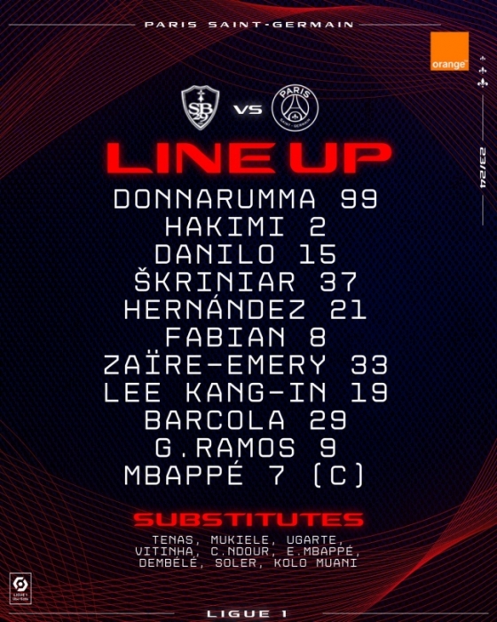 PSG는 4-4-2 포메이션을 가동했다. 최전방 투톱에 킬리안 음바페, 곤살루 하무스가 출격했다. 오른쪽 윙어에 이강인, 왼쪽 윙어로 브래들리 바르콜라가 섰다. 중원은 파비안 루이스와 워렌 자이르 에머리가 형성했다. 포백은 아치라프 하키미, 다닐루 페레이라, 밀란 슈크리니아르, 뤼카스 에르난데스가 포진했다. 골키퍼 장갑은 지안루이지 돈나룸마가 꼈다.