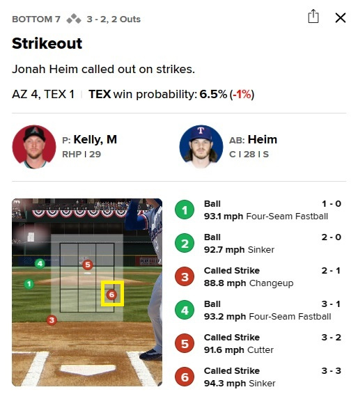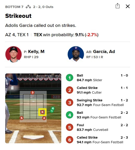 투구 수가 많아질수록 체력이 떨어져 제구도 흔들리기 마련. 하지만 켈리는 마지막 이닝인 7회에도 반박이 불가한 제구력으로 루킹 삼진 두 개로 삼자범퇴 이닝을 만들며 현지 중계진의 감탄사를 불러일으켰다. 아돌리스 가르시아는 바깥쪽 구석에 정확히 꽂히는 포심 패스트볼에, 요나 하임은 자신의 몸쪽으로 들어오는 테일링 걸린 싱커에 꼼짝 못 하고 고개를 숙이며 팬들의 혀를 내두르게 했다.