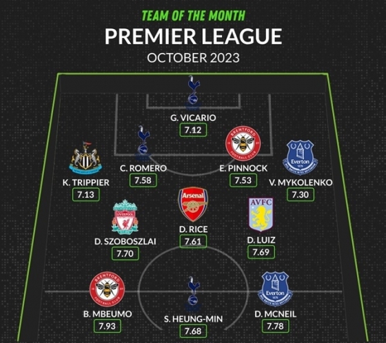 또 10월 팀과 관련해 미드필더 3명은 리버풀 도미니크 소보슬라이(평점 7.70), 아스널 데클란 라이스(평점 7.61), 아스톤빌라 더글라스 루이스(평점 7.69)가 뽑혔다. 포백은 왼쪽부터 에버턴 비탈리 미콜렌코(평점 7.30), 브렌트포드 에단 피녹(평점 7.53), 토트넘 로메로, 뉴캐슬 키에런 트리피어(평점 7.13)였다. 골키퍼는 알리송 베커(리버풀), 에데르송(맨시티) 등을 제치고 비카리오가 차지했다.