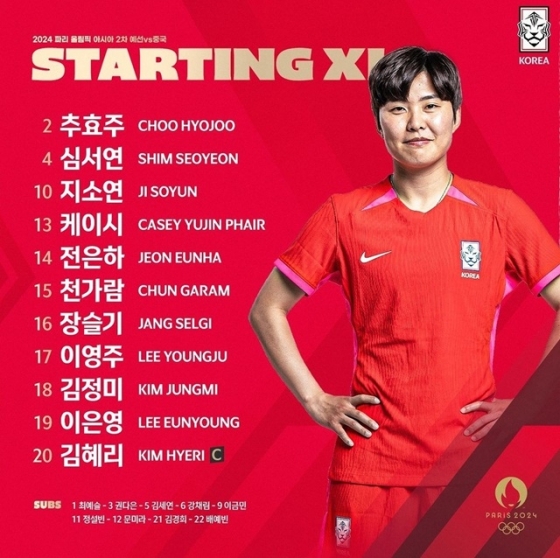 이날 벨 감독은 3-4-1-2 포메이션을 꺼내들었다. 천가람과 케이시 유진이 투톱으로 나섰고, '베테랑' 지소연(수원FC)이 2선에서 공격을 지원했다. 장슬기(인천현대제철)와 전은하(수원FC)가 중원을 맡았다. 양 측 풀백은 추효주(수원FC), 이은영(고려대)이었다. 스리백은 심서연(수원FC), 이영주(마드리드 CFF), '캡틴' 김혜리(인천현대제철)가 맡았다. 골문은 김정미가 지켰다.