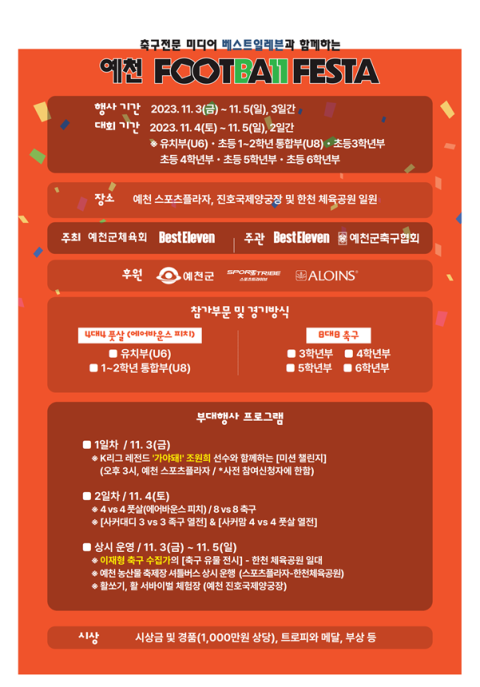 [스포탈코리아] 이현민 기자= 53년 역사의 축구 전문지 베스트일레븐(대표이사 박정선)은 경북 예천군(군수 김학동), 예천군축구협회(회장 권용갑)와 함께“풋볼페스타”를 개최한다.