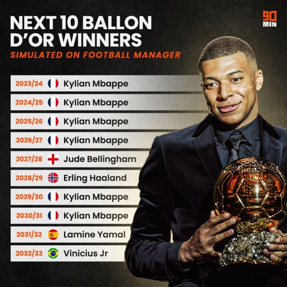 영국 매체 ‘90min’은 축구 시뮬레이션 게임 ‘풋볼 매니저’의 정보를 활용해 향후 10년 발롱도르 수상자를 예측했다.