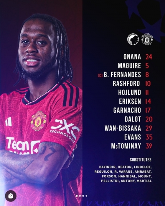 또 맨유는 크리스티안 에릭센과 스콧 맥토미니 중원을 조율했다. 포백은 디오고 달로트, 조니 에반스, 해리 매과이어, 아론 완비사카였다. 골문은 안드레 오나나가 지켰다.