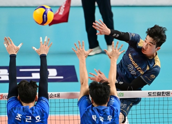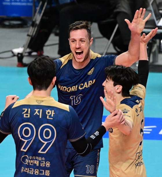 서울 우리카드가 1위로 우뚝 섰다. 마테이 콕과 한성정, 김지한 삼각편대를 앞세운 우리카드는 대전 삼성화재를 제치고 단독 1위로 도약했다.