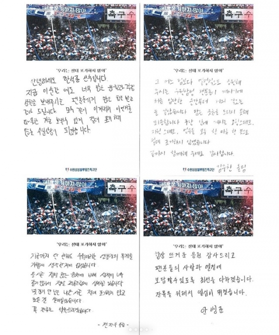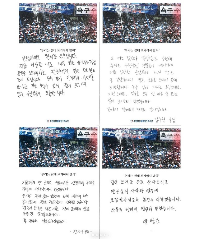 수원 선수들이 힘든 상황 속에서도 끝까지 응원을 보내주는 팬들에게 약속했다. 선수 한 명 한 명 정성스레 손편지를 남겼다.
