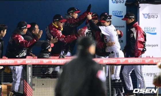 KT는 5회초 반격했다. 선두타자 배정대와 후속 김상수의 연속 중전 안타로 무사 1, 2루 기회를 만든 뒤 2사 후 켈리가 폭투를 범하면서 3루 주자 배정대가 득점했다.(3-1)