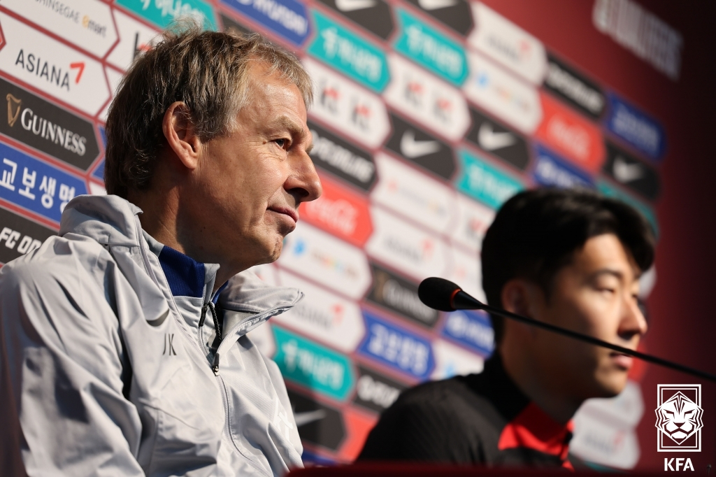 경기를 하루 앞둔 15일 서울월드컵경기장에서 열린 사전 기자회견에서 주장 손흥민과 클린스만 감독이 참석했다.