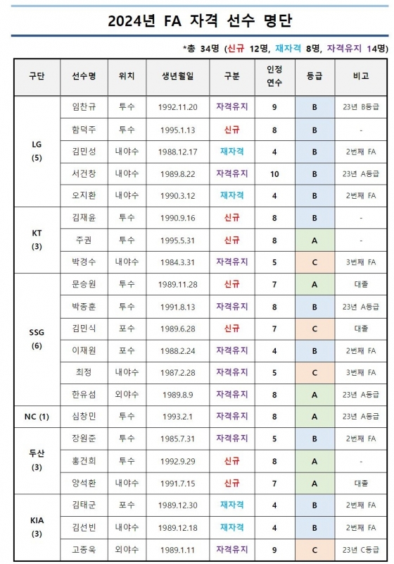 2024년 FA 자격 선수는 총 34명이다. FA 등급 별로는 A 등급 8명, B 등급 14명, C 등급 12명이다. 처음 FA 자격을 얻은 선수가 12명, 재자격 선수는 8명, 이미 FA 자격을 취득했지만, FA 승인 신청을 하지 않고 자격을 유지한 선수는 14명이다.
