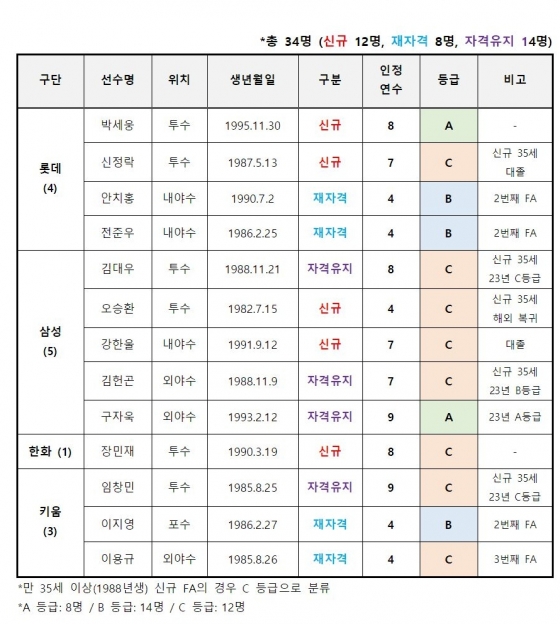 -A등급(총 8명) : KT 주권, SSG 문승원, SSG 한유섬, NC 심창민, 두산 홍건희, 두산 양석환, 롯데 박세웅, 삼성 구자욱