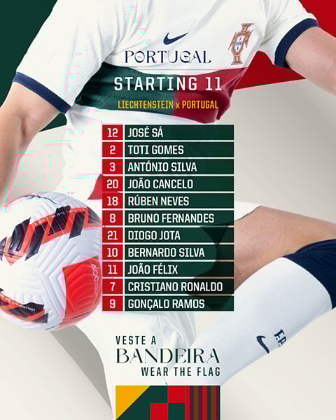 포르투갈은 3-4-2-1 포메이션으로 경기에 나섰다. 곤살로 하무스가 최전방 스트라이커를 맡았고 주앙 펠릭스, 호날두가 뒤를 받쳤다. 중원은 브루누 페르난데스, 베르나르두 실바였고 좌우측 윙백으로 디오구 조타와 주앙 칸셀루가 나섰다. 스리백은 토티 고메스-후벵 네베스-안토니오 실바였다. 골키퍼는 조세 사였다.