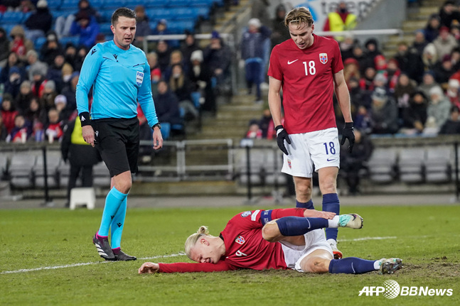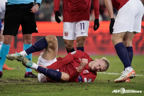 '괴물 공격수' 엘링 홀란드(맨시티)가 A매치를 소화하던 중 예상치 못한 부상을 당했다. 소속팀 맨시티 일정에도 악영향을 끼칠 수 있다.