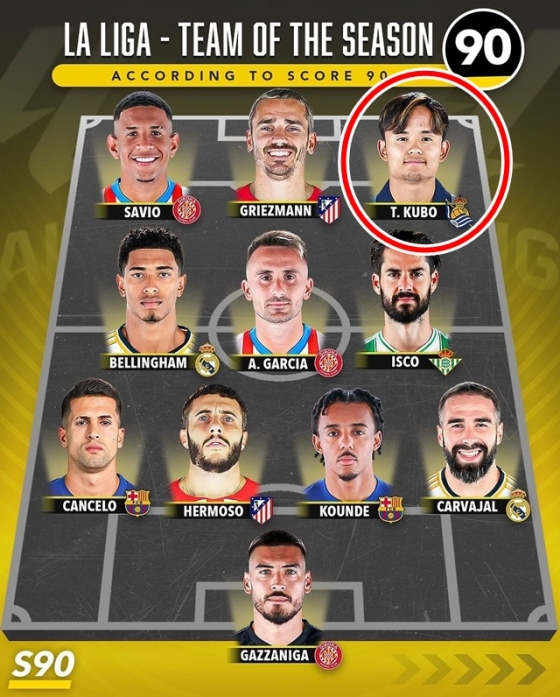 스코어90은 베스트11 스리톱으로 쿠보와 함께 앙투완 그리즈만(아틀레티코 마드리드), 사비오(지로나)를 선발했다. 미드필더는 주드 벨링엄(레알 마드리드)을 비롯해 알레이스 가르시아(지로나), 이스코(레알 베티스)였다.