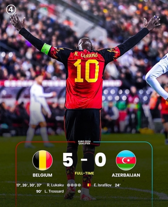루카쿠는 전반 37분 4번재 골까지 뽑아냈다. 아제르바이젠 진영에서 상대 공격을 끊어낸 벨기에는 정확한 패스 플레이를 통해 수비벽을 무너뜨렸다. 이어 페널티박스 안에서 공을 잡은 루카쿠가 침착한 슈팅을 날려 마침표를 찍었다.