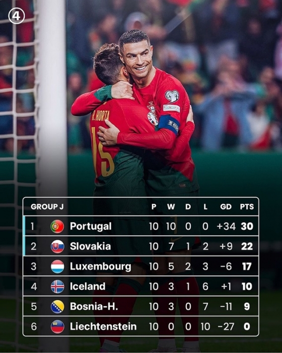 한편 호날두가 뛰고 있는 포르투갈은 10전 전승(승점 30) 대기록을 작성했다. 포르투갈은 이날 포르투갈 리스본에 위치한 이스타지우 조제 아우발라지에서 열린 유로 예선 J조 10라운드에서 아이슬란드를 상대로 2-0으로 이겼다. 이로써 포르투갈은 유로 예선 10경기에서 모두 승리하는 위력을 발휘했다.