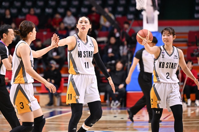 1쿼터를 18-8로 앞서나간 KB는 2쿼터 들어서도 흐름을 이어갔다. 허예은과 심성영, 이채은 등 가드진의 득점포가 이어지며 야투가 살아난 BNK의 추격을 뿌리쳤다. 한때 7점 차까지 쫓긴 KB는 강이슬의 자유투 4개가 모두 들어간데 이어 득점포까지 가동되면서 도망갔고, 쿼터 막판에는 김예진이 스틸 후 본인이 3점포를 터트렸다. 결국 전반은 KB의 42-24, 18점 차 리드로 마감됐다.