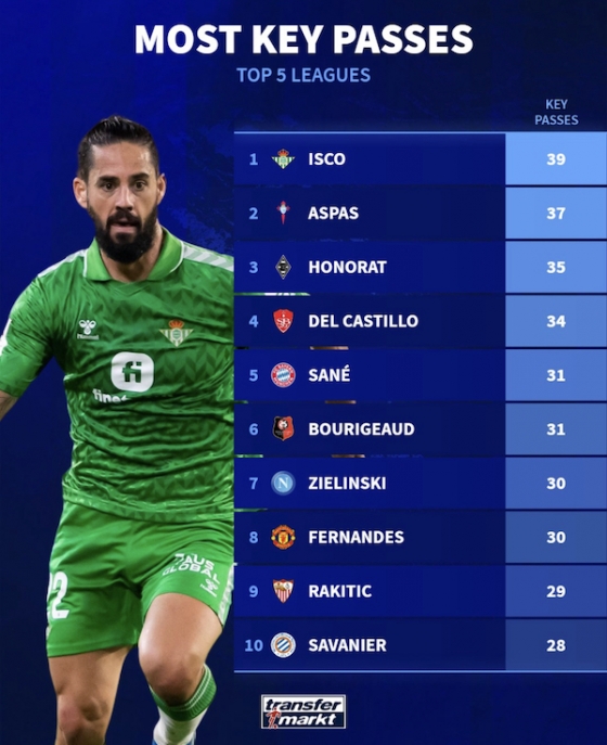[스포탈코리아] 주대은 기자= 왕년 유망주 이스코가 유럽 5대리그에서 키패스를 가장 많이 기록했다.