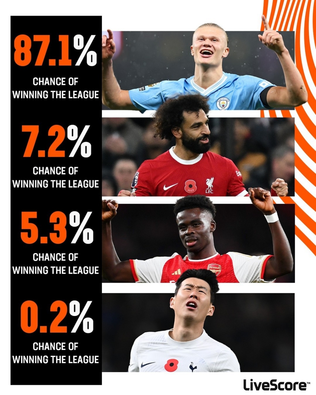 축구 통계 사이트 ‘livescore’는 24일 ‘옵타’의 정보를 활용해 2023/23시즌 프리미어리그(PL) 우승 확률을 공개했다.