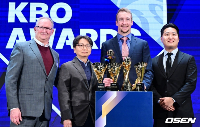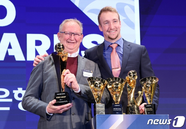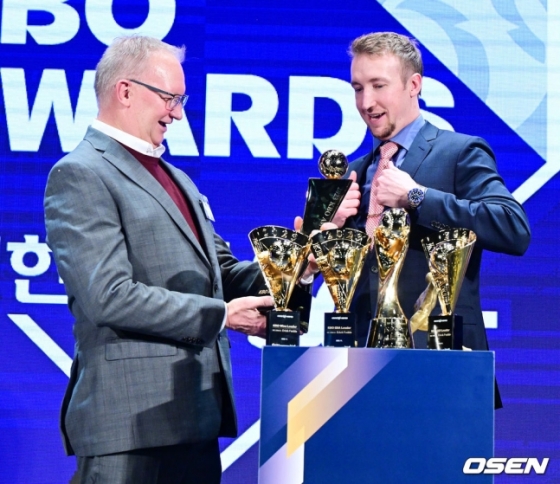 페디는 27일 웨스틴조선 서울 그랜드볼룸에서 열린 2023 신한은행 SOL KBO 시상식에서 MVP를 포함해 5개의 트로피를 품에 안았다.