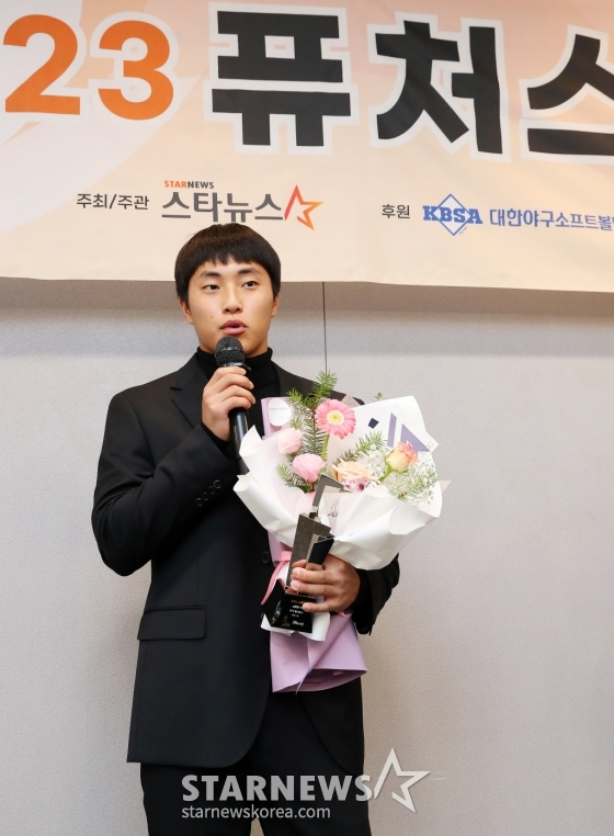 세광고 박지환이 28일 오후 서울 종로구 광화문 빌딩에서 진행된 글로벌 스포츠·연예 콘텐츠 미디어 스타뉴스 주최 '2023 퓨처스 스타대상'에서 야구 스타상을 수상한 뒤 소감을 말하고 있다.