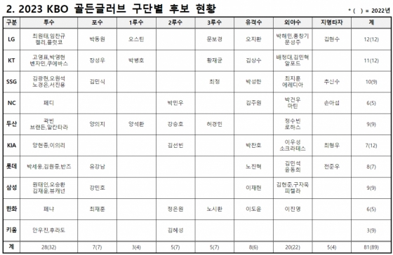 한국야구위원회(KBO)는 29일 2023 신한은행 SOL KBO 골든글러브 후보를 확정해 발표했다. 올해 골든글러브 후보는 총 81명이다. 이들 중 KBO 리그에서 포지션 별로 최고의 활약을 펼친 선수 10명만이 최종 수상의 영예를 누릴 수 있다.