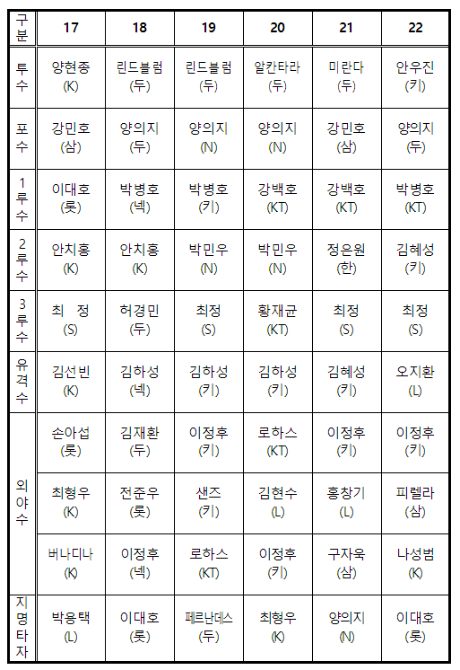 3루수 역시 5명이었는데, 격전지가 될 가능성이 있다. LG 문보경( 득점 11위, 타율 14위, 장타율 15위)과 KT 황재균, SSG 최정(장타율 1위, 홈런 2위, 득점 4위, 타점 7위, 출루율 9위), 두산 허경민, 한화 노시환( 홈런/타점 1위, 장타율 2위, 득점 7위, 안타 8위, 출루율 10위, 타율 15위)이 후보에 자리했다.