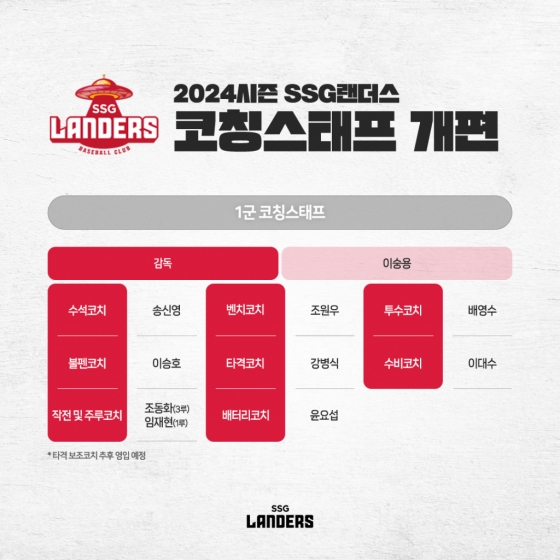신규 코치는 송신영, 배영수, 강병식, 윤요섭 등 4명으로 SSG는 "파트별 전문성과 코칭 능력을 갖춘 코칭스태프 인선에 초점을 맞췄다"고 전했다.