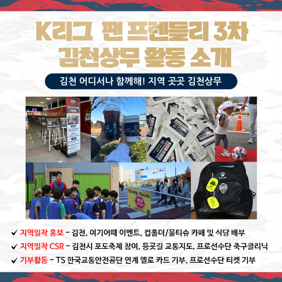 김천은 지역밀착 홍보, 지역 행사 참여, 미래세대 성장 프로젝트 등 연고지역밀착을 위한 다양한 이벤트를 시행했다. 김천시 내 지역 명소를 소개하는 ‘김천 여기어때’ 연간 이벤트는 참여횟수 152회, 참여자 중 전 경기 참여율 88.9%를 이끌어냈다. 또한 컵홀더, 물티슈 등을 제작해 지역 카페와 식당에 배부하는 지역 상생 프로젝트를 실시했다. 두 이벤트는 각각 팬 만족도 1, 2위를 기록했다.